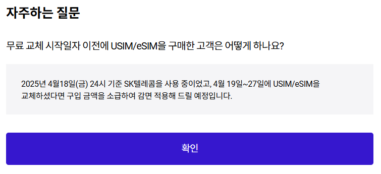 SKT는 모든 고객 대상으로 유심 무료 교체를 지원하고 있어요! 대리점이나 공항 로밍센터 어디서든 간단하게 교체할 수 있습니다.
